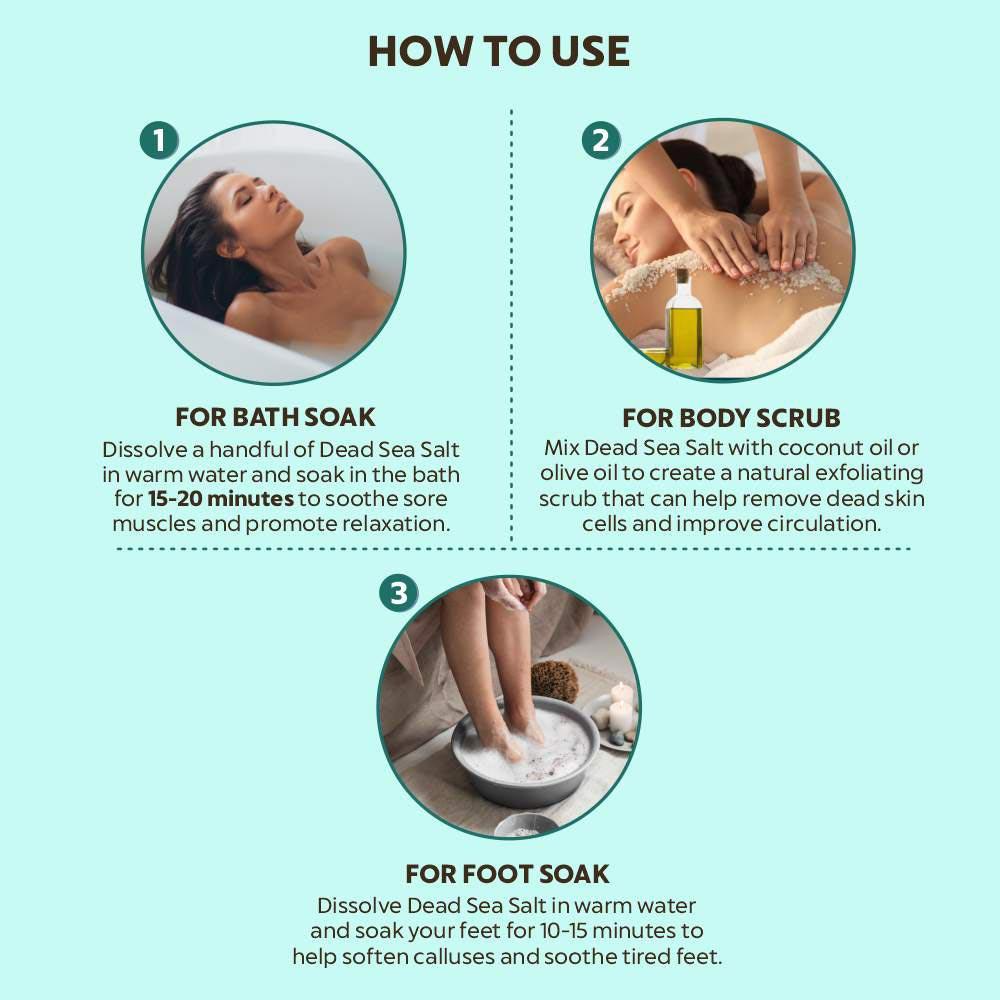 For Bath Soak: Dissolve a handful of Dead Sea Salt in warm water and soak in the bath for 15-20 minutes to soothe sore muscles and promote relaxation.