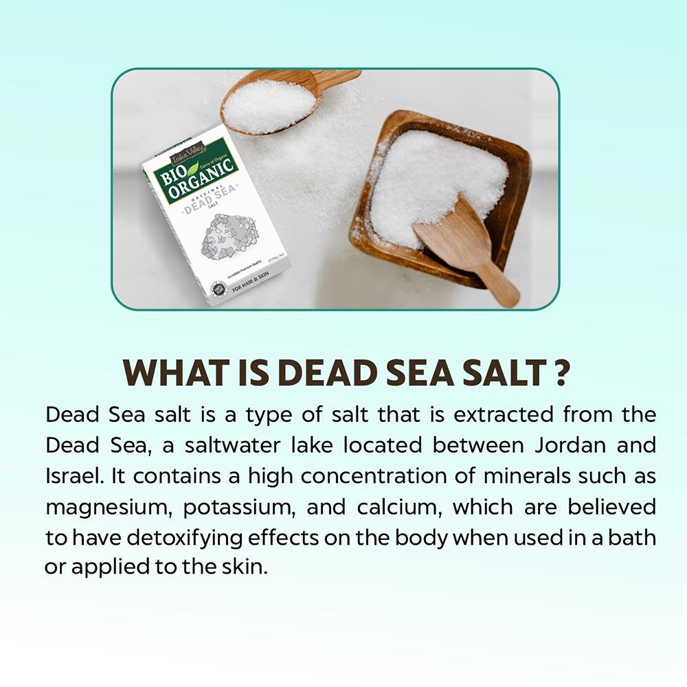 Dead Sea salt is a type of salt that is extracted from the Dead Sea, a saltwater lake located between Jordan and Israel. It contains a high concentration of minerals such as magnesium, potassium, and calcium, which are believed to have detoxifying effects on the body when used in a bath or applied to the skin.