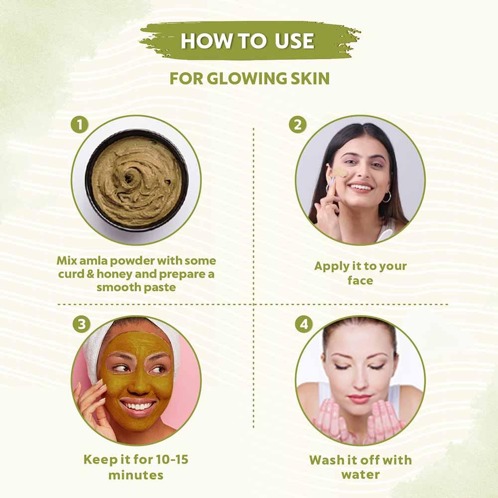 Amla powder for glowing skin:Step 1. Mix amla powder with some curd and honey and prepare a smooth paste.