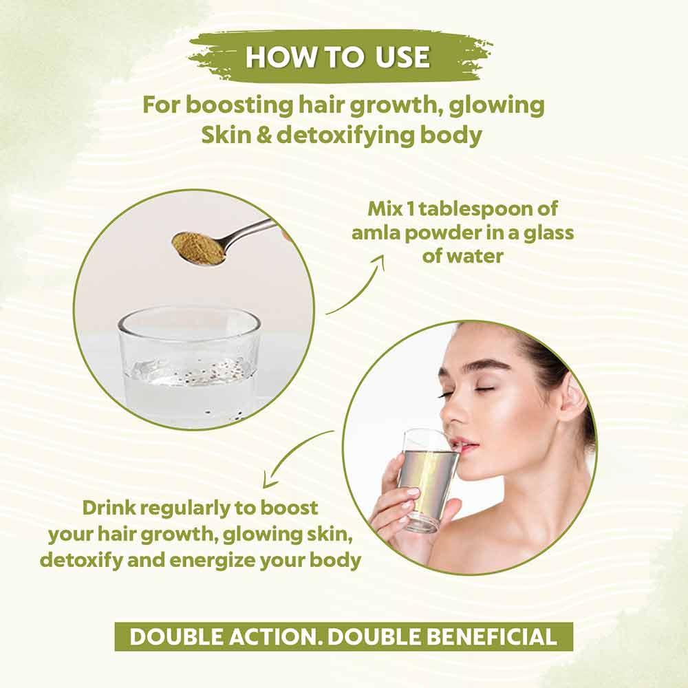 Amla fruit powder, offers several benefits, Hair growth, Hair conditioning, Scalp health, Antioxidant-rich, Skin brightening, Collagen production, Skin nourishment, and Makes a detoxifying energy drink, etc.