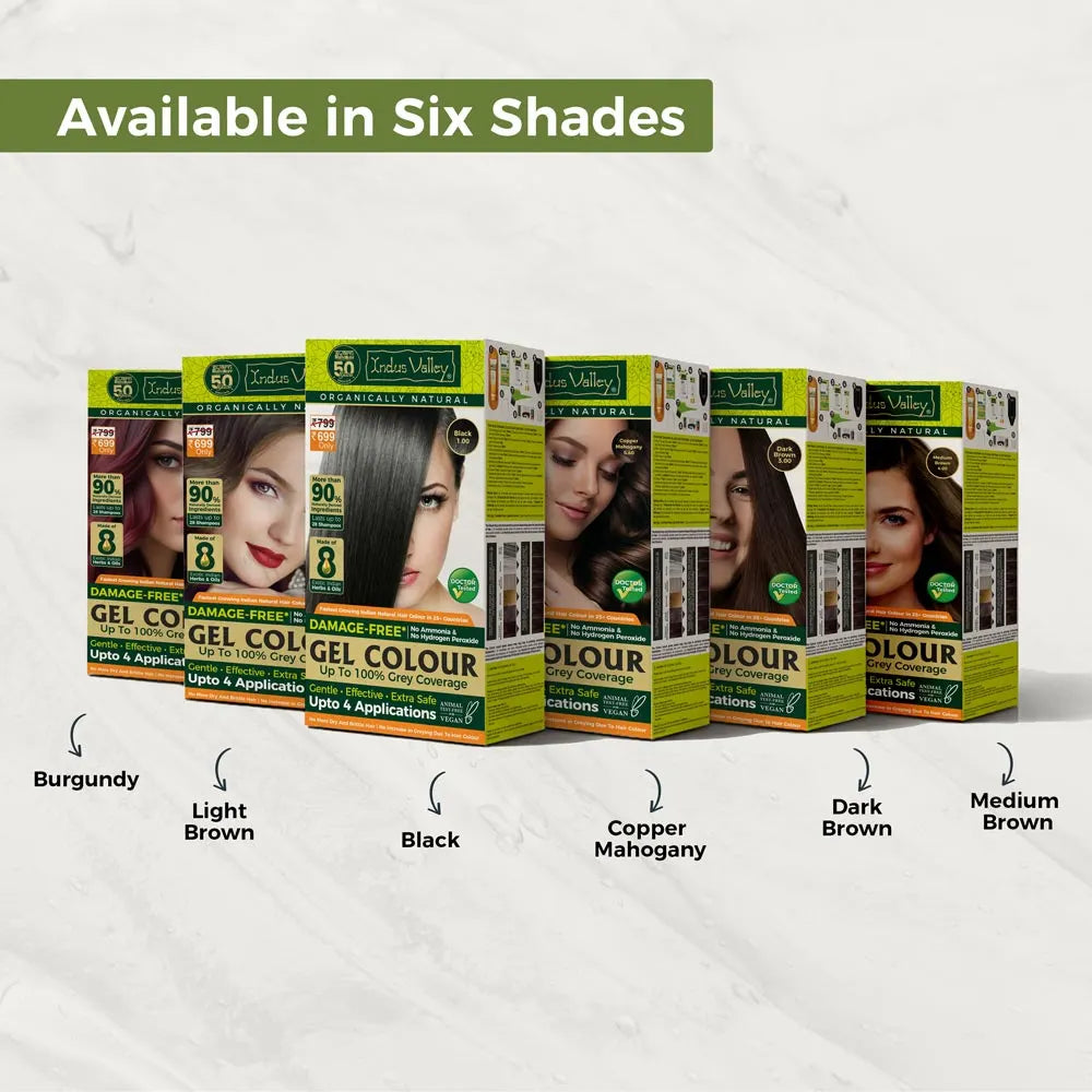 Unlike chemical dyes, Indus Valley Damage-Free Gel Hair Colours contain no Ammonia, Peroxide (HPO), or PPD, making them gentler on hair. Because they don’t use strong fixers, regular application is key.